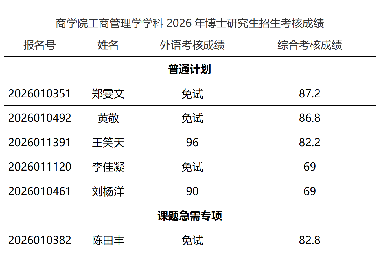 关于公布商学院2026年博士生招生考核成绩及拟录取名单的通知